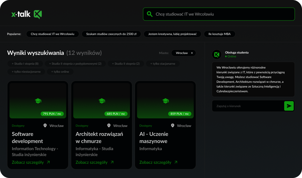 X-TALK Commerce pomaga klientom szybciej znaleźć właściwy produkt dzięki wyszukiwaniu w języku naturalnym, inteligentnym rekomendacjom i konwersacyjnemu prowadzeniu przez ofertę — w czacie i voice.